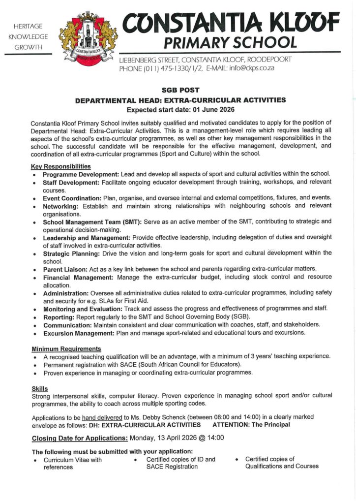 Departmental Head Extra-Curricular activities vacancy: